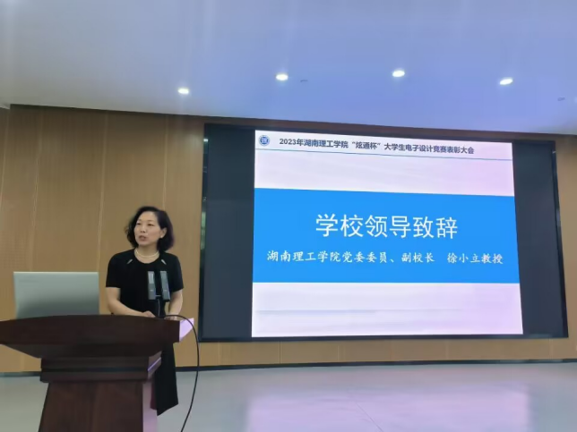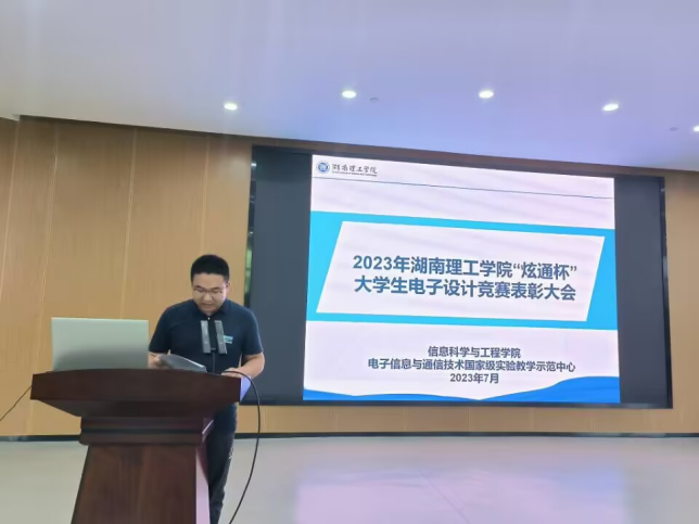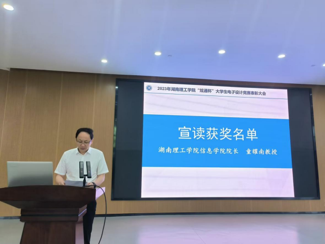 炫通公司技术总监李勇奇发言,他祝贺本次比赛圆满成功,感恩母校对自己的培养和为公司输送专业人才,分享了当年自己参加电子竞赛的经验,同时表示炫通公司会继续加强与母校的联系,进一步支持电子设计竞赛等多项科技创新工作,欢迎信息学子来公司工作或实习。