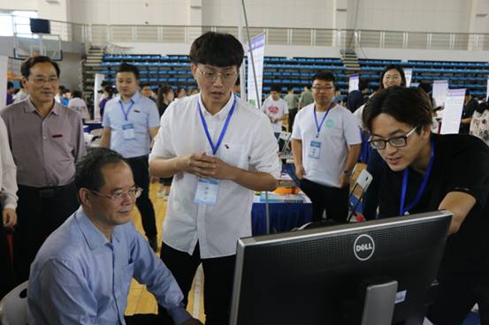 在参赛作品展示环节,湖南省教育厅副厅长葛建中来到展台前亲自体验公司参赛作品,并对员工赞赏有加,鼓励同学们继续努力。(研究生院付亚子/信息公司潘理)