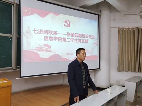 为深入贯彻落实校领导班子成员深入基层开展“七进两联系”工作,10月15日下午,副董事长张国云走进信息公司第二党支部,给同学们上了一堂“不忘初心、牢记使命”主题教育课,公司党总支书记甘向阳、员工第二党支部全体党员参加。