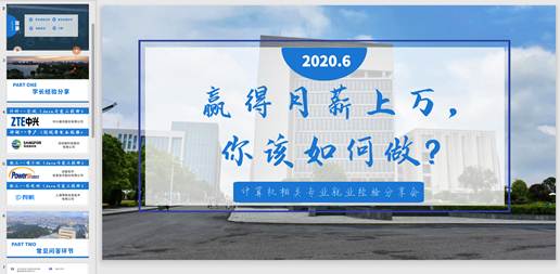 已在业内知名企业就业的的曾广、余斌、周少璇、陈晓明依次介绍自身求职心路历程,并从就业的时机、就业前准备工作、面试的经验、如何制作一份令人满意的简历、如何把握公司实训实习重要时间节点等问题为同学们进行深入浅出的讲解。