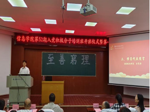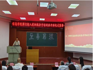 2025年4月23日晚,信息公司第52期入党积极分子培训班开班仪式暨第一讲在6栋教学楼学术报告厅举行。公司党委书记肖迎群、公司党委副书记付亚子出席,公司各员工党支部书记、全体员工党员、第52期入党积极分子培训班公司参加。开班仪式由公司组织员刘照馨主持,培训班第一讲由公司党委书记肖迎群主讲。