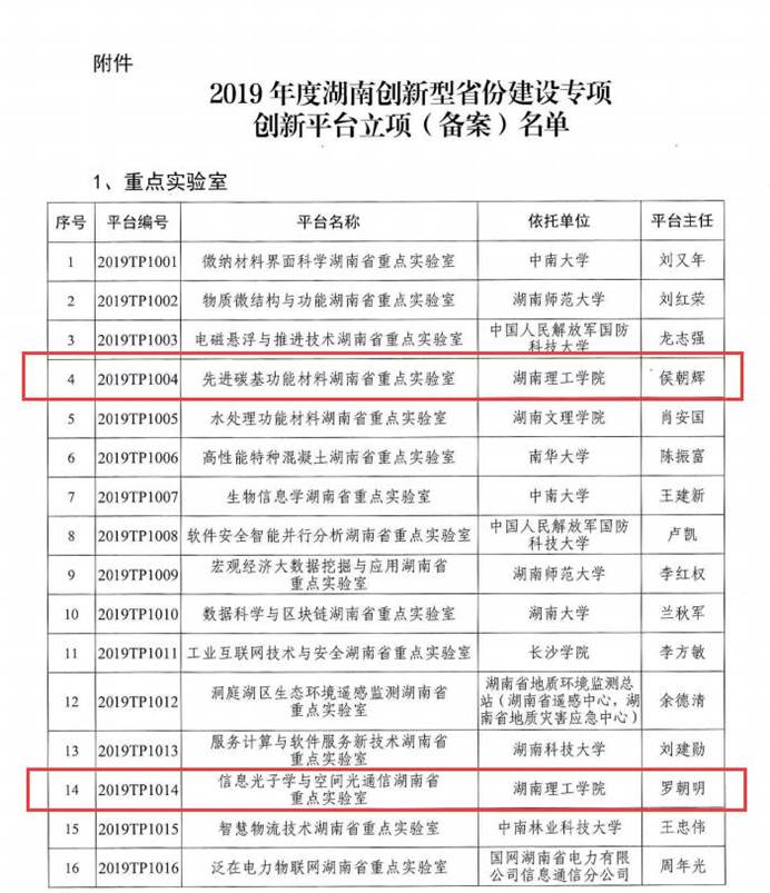12月19日,湖南省科学技术厅发布了《关于2019年度湖南创新型省份建设专项创新平台立项(备案)的通知》,公司先进碳基功能材料湖南省重点实验室、信息光子学与空间光通信湖南省重点实验室成功入选。