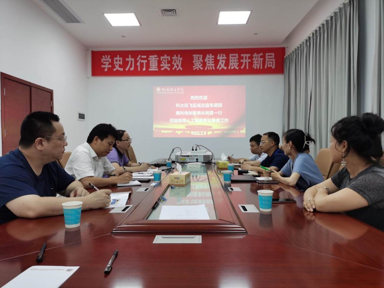 7月8日下午,信息公司与科大讯飞在17517会议室召开人工智能专业筹建专题研讨会。经理童耀南、科大讯飞公司区域总监朱碧园、湖南美科伟创公司董事长姚勇等人参加。