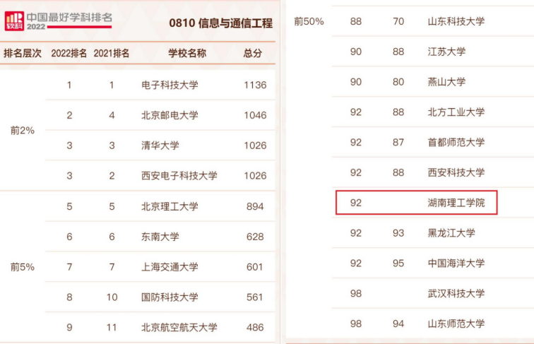 2022年排名榜单包括96个一级学科,各个学科排名的对象是在该一级学科设有学术型研究生学位授权点的所有高校,发布的是排名全国高校前50%的学科。今年湖南省有国防科技大学、中南大学、湖南大学、tyc539太阳集团等4所高校的信息与通信工程学科上榜。