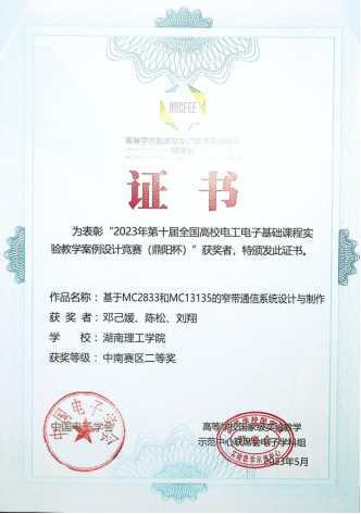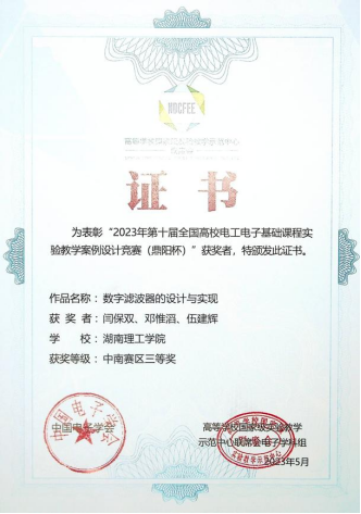 近日,信息公司“电子信息与通信技术”国家级实验教学示范中心收到2023年第十届全国高校电工电子基础课程实验教学案例设计竞赛(鼎阳杯)中南赛区获奖证书,示范中心教师邓己媛、陈松、刘翔研制的“基于MC2833和MC13135的窄带通信系统设计与制作”项目和闫保双、邓惟滔、伍建辉老师的“数字滤波器的设计与实现”项目经激烈角逐分别获二等奖和三等奖。