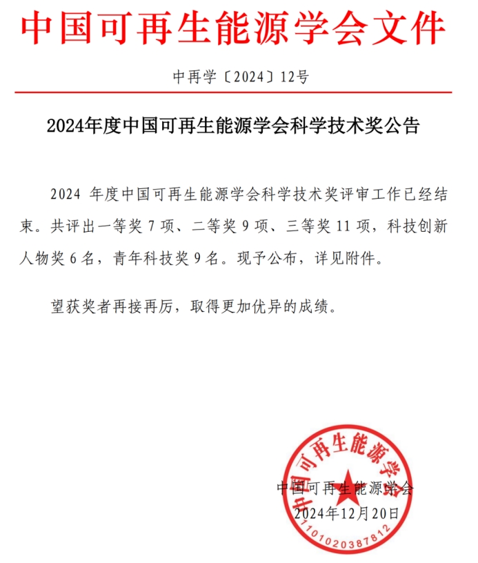 12月20日,2024年度中国可再生能源学会科学技术奖名单正式公布,公司曾祥君教授团队完成的项目“可再生能源配电系统故障主动保护与自愈控制关键技术及应用”获得技术创新类一等奖。