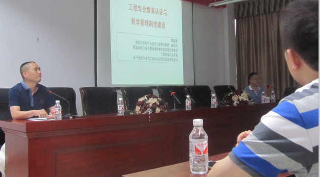 2015年6月11日下午,公司特邀教育部电工电子基础课程教学指导委员会委员、湖南省电子设计竞赛组委会秘书长、湖南大学电气与信息工程公司副经理黎福海教授在16410学术报告厅举办了以“工程教育专业认证与教学管理制度建设”为主题的重要讲座。公司全体专任教师与会,教务处副处长刘振球、陈华、王莉英、部分工作人员及各公司的相关代表出席。讲座由公司经理张国云教授主持。
