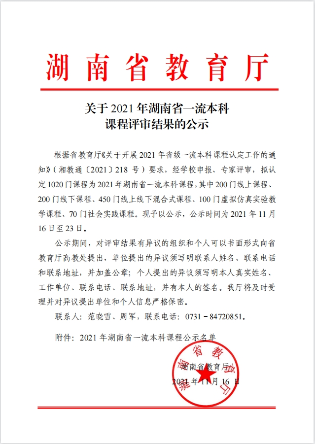 近日,湖南省教育厅发布2021年度省级一流本科课程认定结果,公司共有27门课程入选省级一流本科课程。其中,信息公司本次共认定各类一流课程4门,包括线上一流课程1门、线下一流课程1门、线上线下混合式一流课程1门、虚拟仿真实验教学一流课程1门。