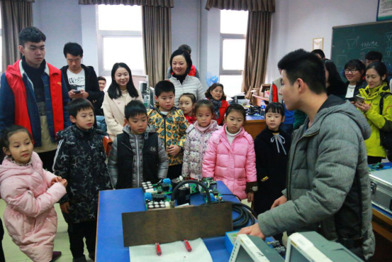 科普活动过程中,讲解员裘寒冰首先带领小朋友参观16栋逸夫楼三楼电子产品展区,介绍各类电子元件及近年来的学术科研作品成果。随后,她带领儿童进入信息公司陈松老师指导的创新基地,在实验室员工刘良振的仔细讲解及对电子类产品的使用演示下,小朋友们亲自着手操控,在交流互动过程中让孩子们近一步走进科学的世界。