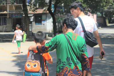 当一切都结束后,志愿者们依旧是撑着伞与每一位小朋友相伴又告别。