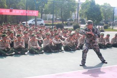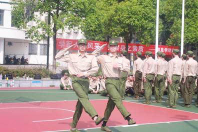 训练场上,绿色的军装化作一道靓丽的风景线,嘹亮的口号荡起一首唯美的歌,整齐的步伐连成一股惊天动地的力量。每个人眼里的稚气不再,取而代之的是成熟和敏锐的光芒。在教官的严格训练下,短短的四天里,同学们严格按照一名合格战士的训练要求,准时出操,刻苦训练,四面转法、蹲下、跨立、稍息、齐步走、解散、集合等既定训练科目已初见成效。