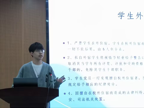 王宇杰、丁徐佳和李思良从寝室卫生、寝室安全等方面进行详解介绍,要求寝室长加强对寝室成员相关知识的讲解。希望各位寝室长发挥带头模范作用,遵守寝室规则。优秀寝室长唐强和陈彩晴从寝室安全卫生、生活氛围、学习成果等方面分享了寝室精神面貌,激励寝室长们做一个有责任心、有爱心的寝室长。