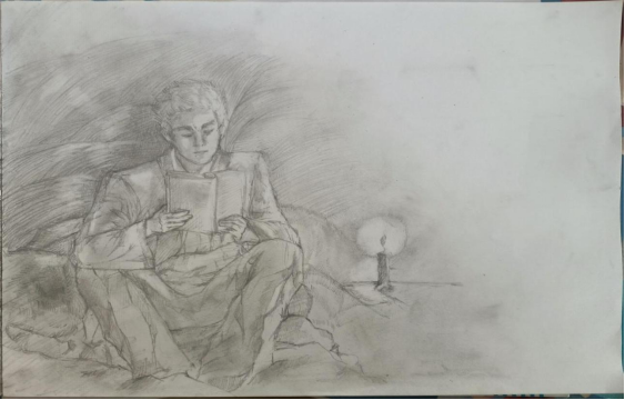 “他们来到门口,不由自主的呆住了。孙少平正背对着他们,他在麦秸秆的一堆破烂被褥里,在一粒豆大的烛光下聚精会神的看书。”自动化22-2BF的雷俊威以烛光为题,描绘了孙少平挑灯夜读的情景。孙少平坚毅勇敢,即便条件艰苦,也要坚持读书的顽强精神深深地打动了无数读者。