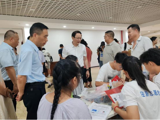 上午9点,公司党委书记张国云、董事长曾祥君、副董事长徐振祥等领导到信息公司迎新点指导工作,了解公司迎新工作安排、新生报到等情况,看望慰问迎新工作人员和志愿者,并与新生进行亲切交流。