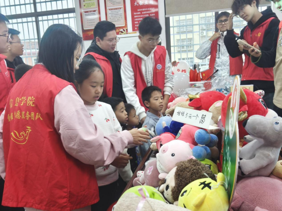活动伊始,志愿者们在义卖摊位上摆满了各式各样的商品,包括玩偶,自制手工艺品以及各类玩具等。少年儿童们在信息公司志愿者的引导下,踊跃参与到了义卖活动中。