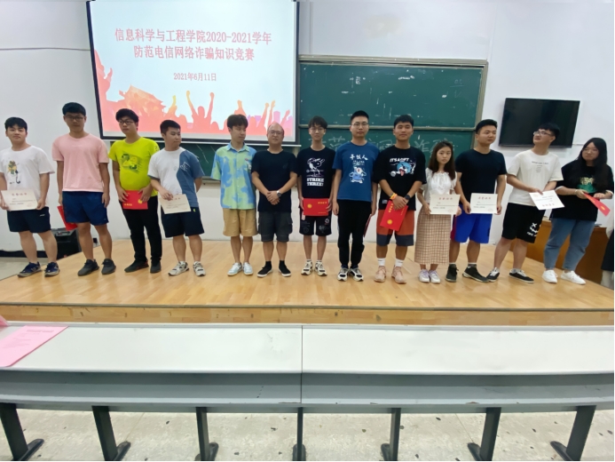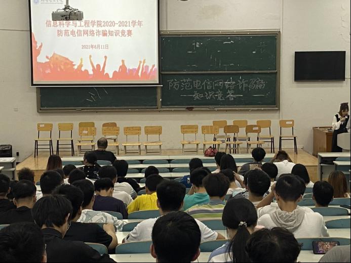 6月11日19:30在9T2举行信息公司防范电信网络诈骗知识竞赛。18级辅导员李亦波出席,院员工会文娱女生部李钟萱主持,共计12组队伍参赛。